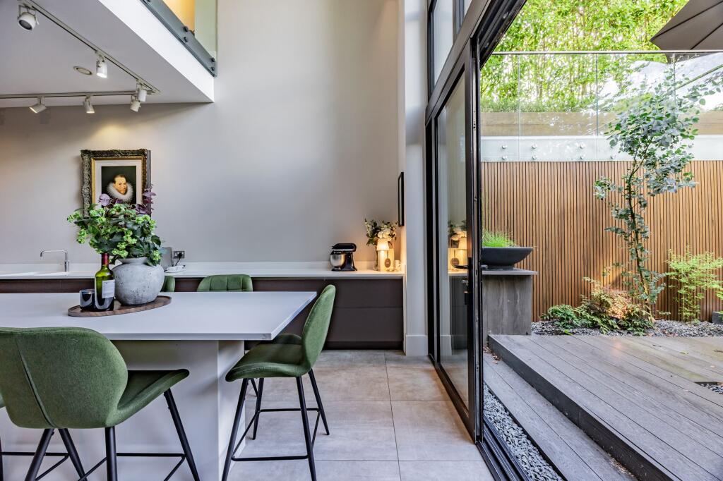 With accommodations arranged over five floors, just some of the highlights include, but are by no means limited to, a showpiece kitchen featuring sculpted worktops, built-in bar, and an expansive island that integrates everything needed for modern living – with floor-to-ceiling sliding doors extending out onto a beautifully decked private courtyard.