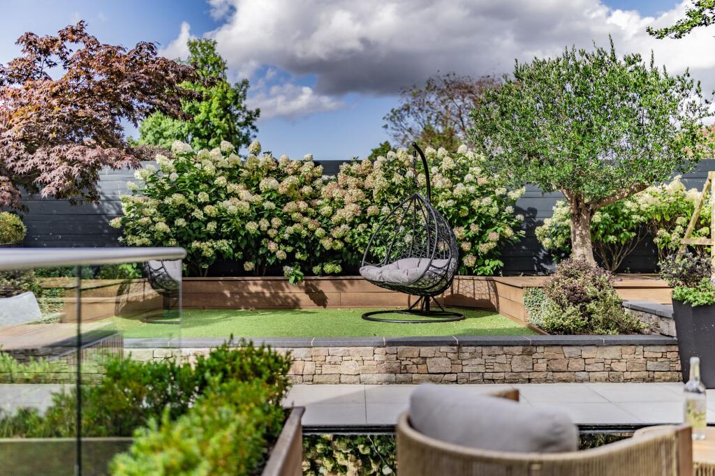 There are several landscaped outdoor ‘sanctuaries’ to enjoy all year round, no matter what the weather has in store, featuring a private terrace with slatted screens, louvered roof, sculptural fire table, integrated lighting, and lush greenery.